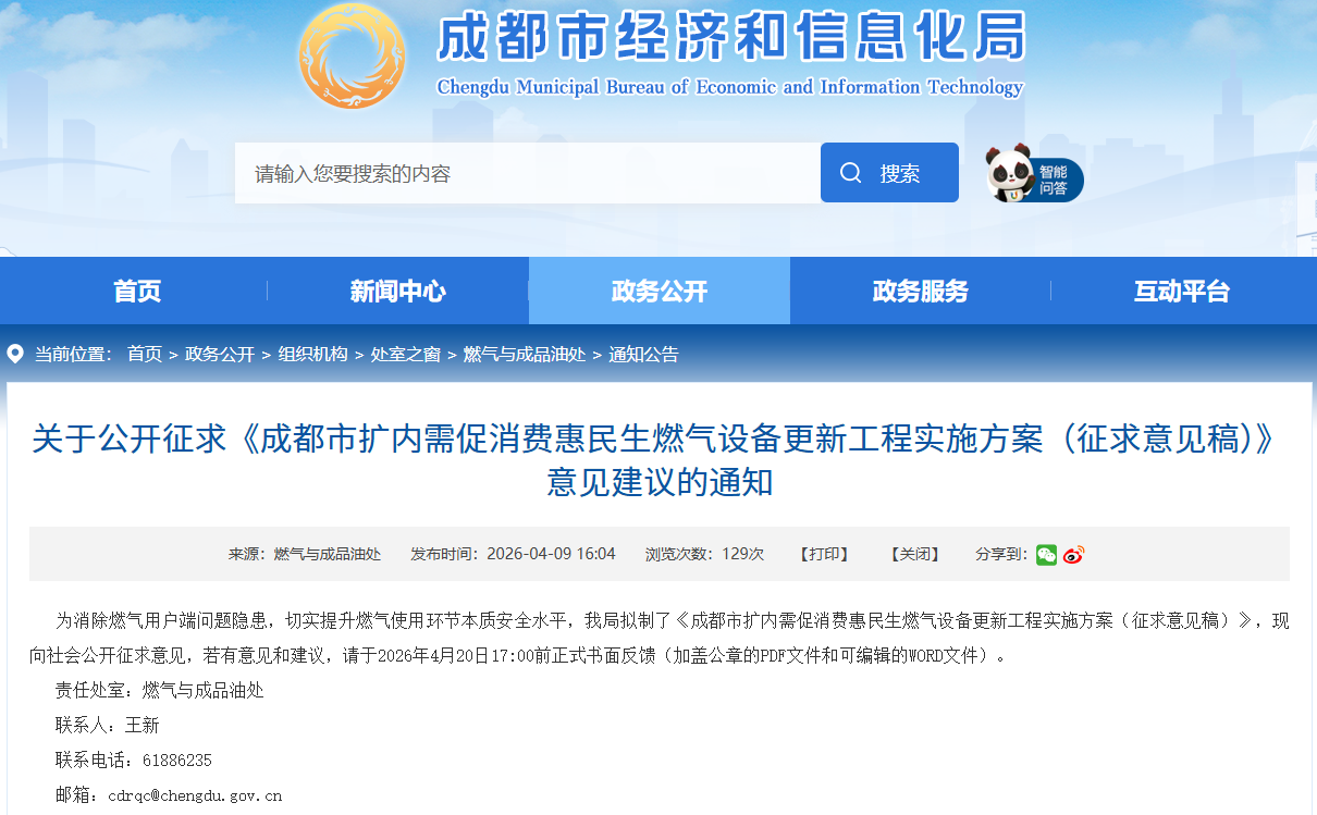 据成都市经济和信息化局官网音讯,成都将在全市施行“扩内需促消费惠民生燃气设备更新工程”,着力消除燃气用户端问题危险,实在提高燃气运用环节实质安全水平。现在,《成都市扩内需促消费惠民生燃气设备更新工程施行方案(征求意见稿)》正在向社会揭露征求意见,时刻到4月20日17:00,包括总体目标、目标及规范、施行流程、责任分工、保证办法5个方面内容。